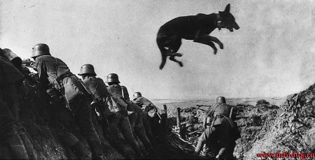 Зрелище было ужасное: 150 обученных и яростных овчарок поднялись против автоматных очередей. Свидетели утверждают, что псы вгрызались в фашистские глотки, даже будучи смертельно ранены! Немцы отступили, но на подмогу им подоспели танки. Искусанные немцы, покрытые рваными ранами, вопящие от ужаса, вскакивали на броню танков и расстреливали героических псов.